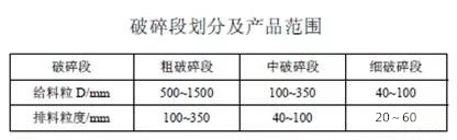 根据所需成品不同,一个破碎流程可分为粗破碎段、中破碎段、细破碎段及磨破段,经过各破碎段进料和破碎后产品粒度范围如下表: