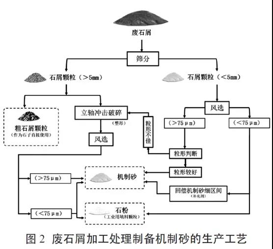 通过调研对比不同的生产工艺,包括专门开采岩石生产机制砂的各种生产工艺及相应的生产设备,分析了废石屑制砂与其的不同之处,提出了一种适用于废石屑进行加工处理制备机制砂的生产工艺,如图2。