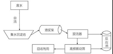 该工艺中,集水沉淀为自然沉淀,人工沉淀为混凝沉淀,脱水设备采用陶瓷过滤机。其中,主要环节“预处理”的工艺流程如下: