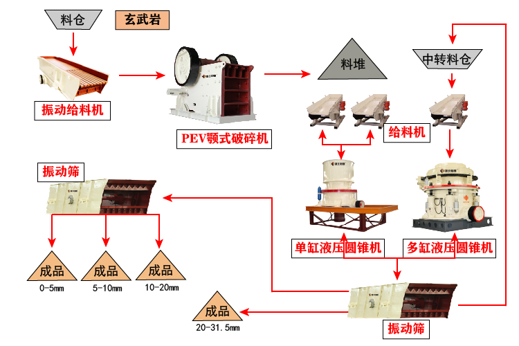玄武岩破碎生产线较为简单,大致分为四个阶段,具体工艺流程如下: