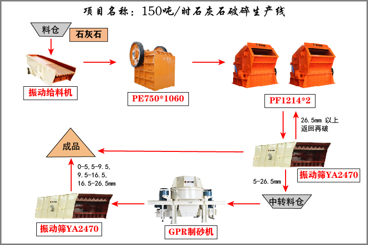 产量:200吨/小时 物料:以青石(石灰石)为主,辅料为石灰石、鹅卵石石 进料要求:≤1000mm 出料要求:≤31.5mm
