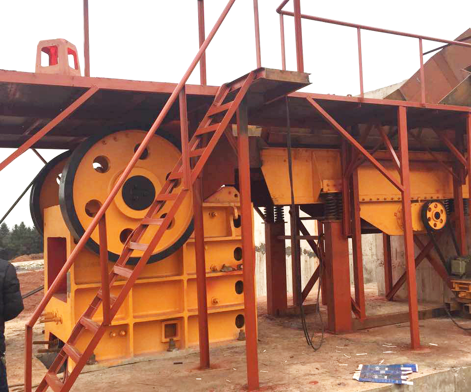 大料斗中的花岗岩由振动喂料机ZSW1100*4200进入颚式破碎机PE-750*1060。原料中含自然风沙较多,所以需要筛分,振动喂料机ZSW1100x4200带有耐磨棒条,间隙为120mm。这种设计的好处是把原料中较小颗粒的料预先分离出来,可以减少颚式破碎机不必要的负担。