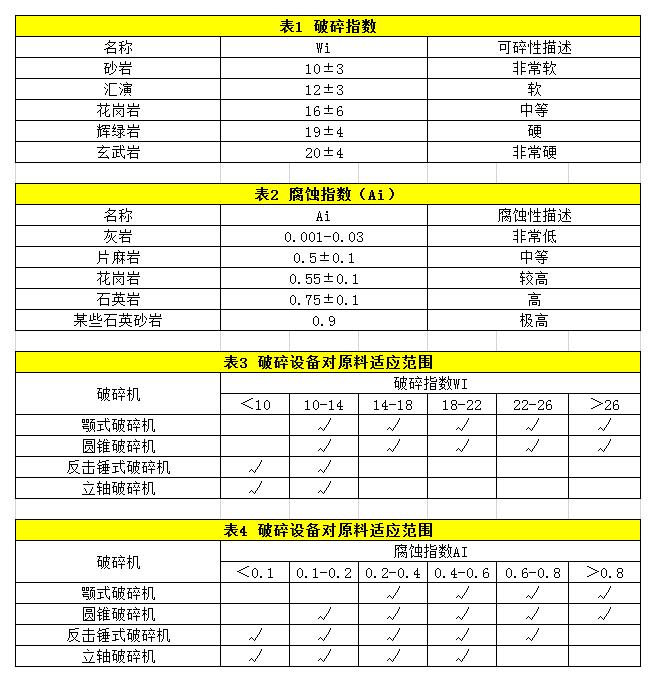 石头破碎生产线设计中的粉碎装置重点由一破、中间破以及整型破碎(整形)构成、每一阶段机械的型号选择重点由岩石的粉碎功指数、磨蚀指数、非常大喂料粒度以及产品的性能标准的。Wi:粉碎功指数——物料粉碎的难易规范,Ai:磨蚀指数——物料对机件的磨损规范,常见岩石的Wi以及Ai见表1、表2。粉碎机械对原石料的适应方面见表3、表4。