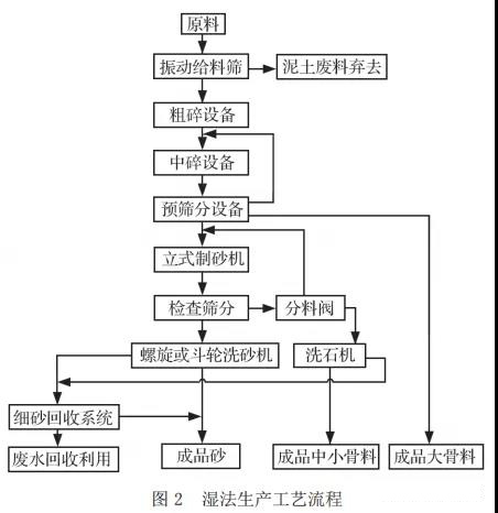 图2所示为典型的湿法生产工艺流程,原料经过振动给料机或振动筛筛去泥土以后,大块原料要经过粗碎和中碎两道破碎后再进行筛分,将原料分成3个部分:达不到产品粒度要求的最粗一级矿石返回中碎设备重新破碎,这部分返料在中碎和筛分之间形成一个闭路循环;中等粒度矿石直接作为骨料成品进入产品仓或者堆场;满足整形制砂机进料粒度要求的原料进入立式整形制砂机进行整形制砂,生产出来的砂石经过检查筛分成砂和各种规格骨料,再经螺旋或斗轮洗砂机冲洗后成为成品砂,骨料可以经洗石机冲洗后成为最终成品。通过分料阀可以调节各种成品骨料的比例。尘设备收集起来,进入密闭的石粉仓。