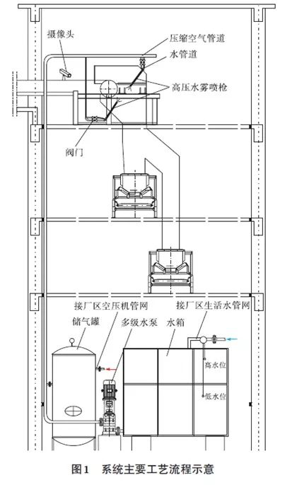 1)在皮带机机头罩安装喷水抑尘装置:4个高压水气混合喷枪通过法兰螺栓连接分别安装固定在皮带机下料斗及皮带机头罩上,上下各2个,呈对称布置。喷淋系统的15m³水箱、1m³储气罐及多级水泵集中布置在中转框架底部0平面,高压水气混合喷枪通过阀门及主水气管线实现上下连接。