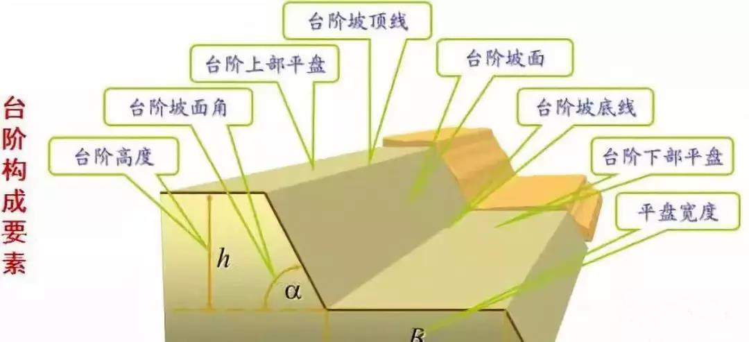 露天矿边坡由台阶、台阶上部平盘、台阶下部平盘、台阶坡面、台阶坡面角、台阶高度、台阶坡顶线、台阶坡底线等构成。