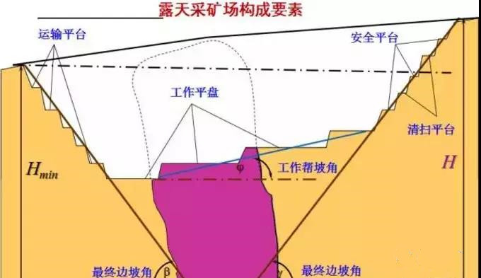 台阶根据其用途可分为工作平台、安全平台、清扫平台、运输平台等。最终边坡是指开采到最终界面的台阶所组成的边坡。最终边坡角是指最终边坡坡面与水平面之间的夹角。